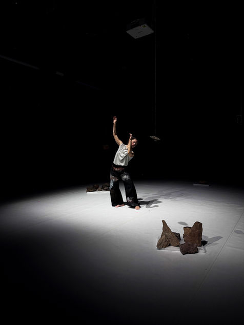 Through movement and somatic attention, she investigates how geological processes — compression, erosion, crystallization — can be experienced through the body, as vibration, density, or inner duration.